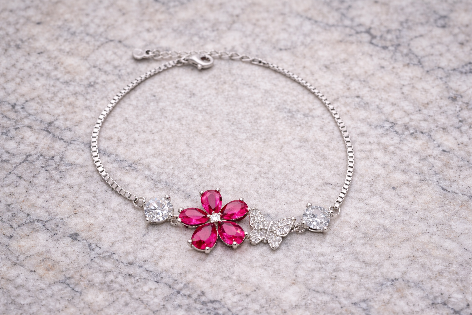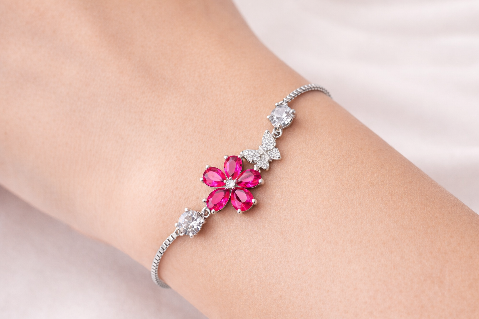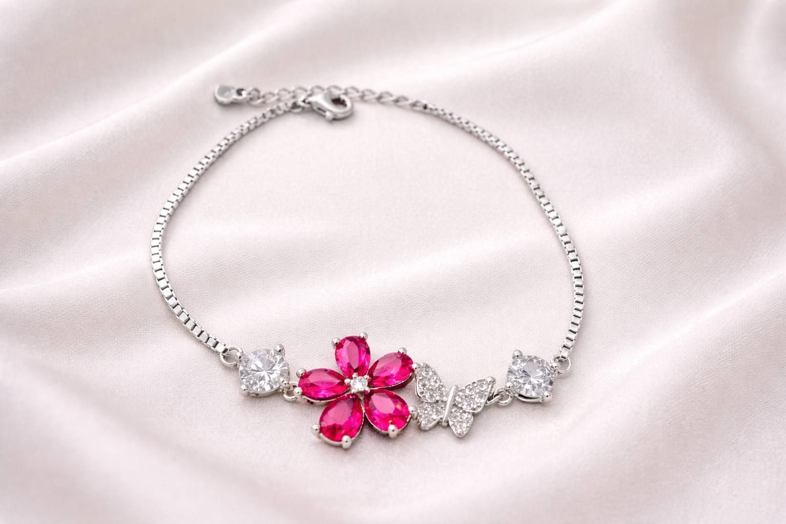 4 gms Silver Bracelet Pink Cubic Zircon Design for women online Adjustable Silver Rate About Jewelry : The diamonds is setted with micro setting to make the look more better.The plating thickness