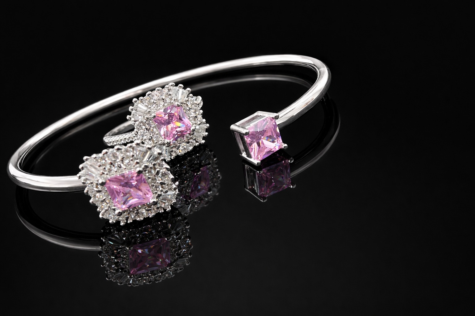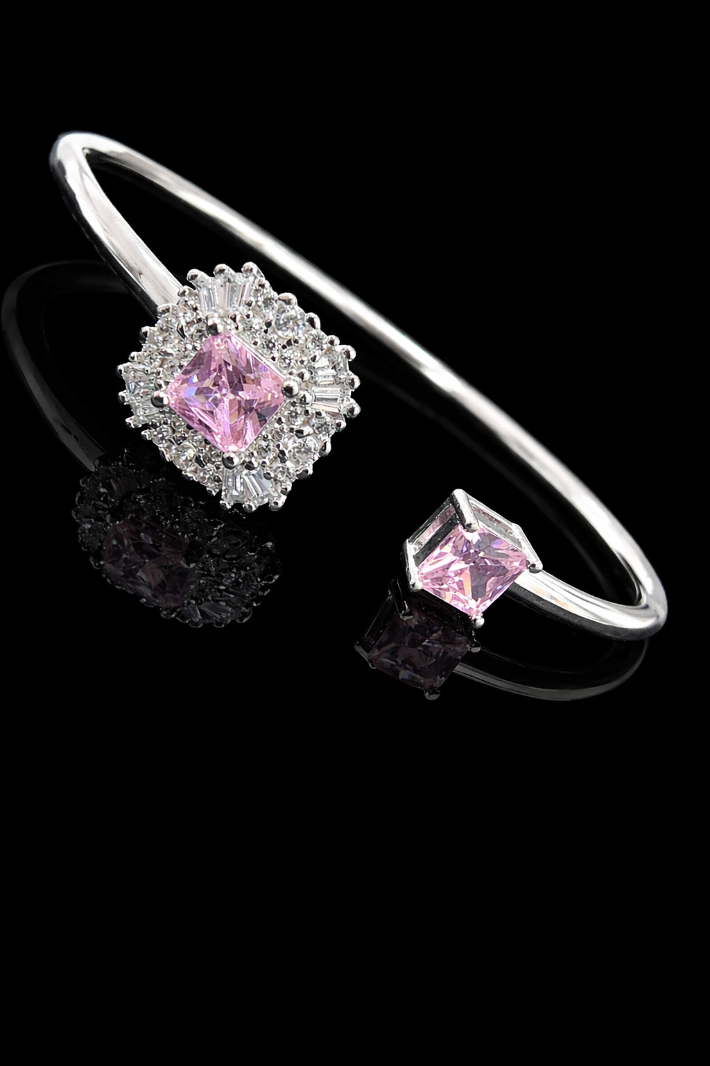 10 gms Silver Bangle and Ring Set Pink Cubic Zircon Design for ladies online Pure Silver 925 About Jewelry : The diamonds is setted with micro setting to make the look more better.The plating thi