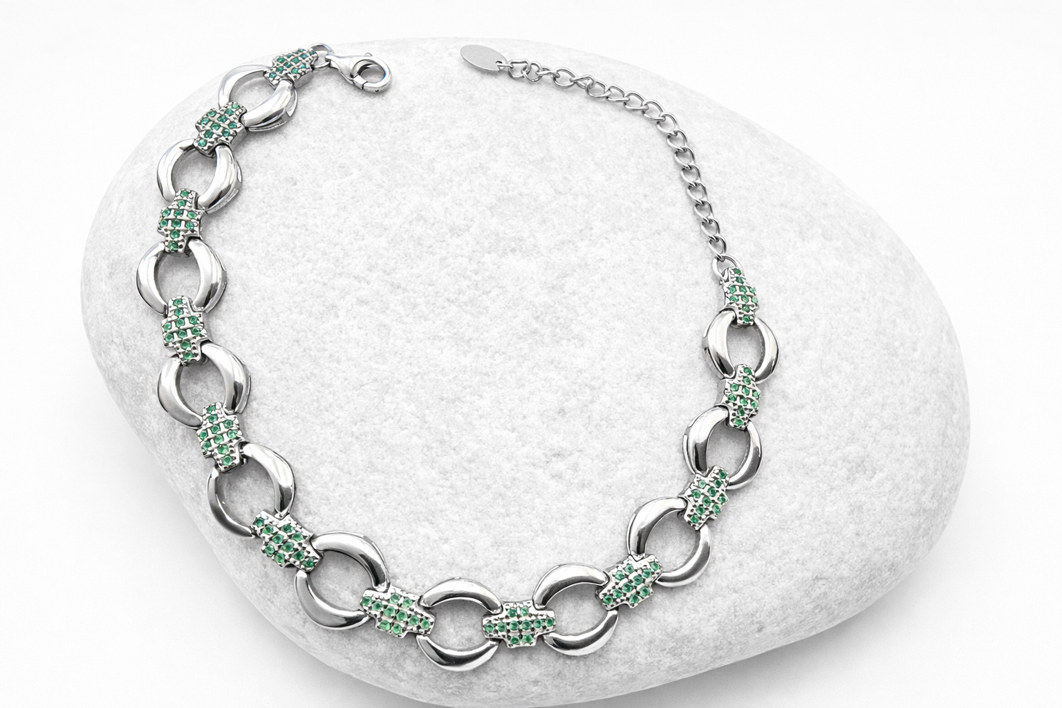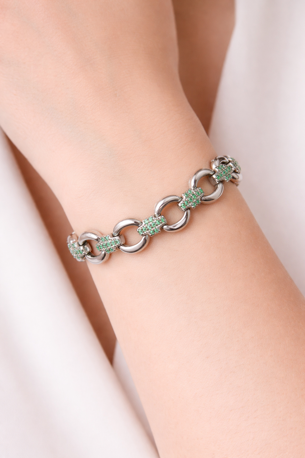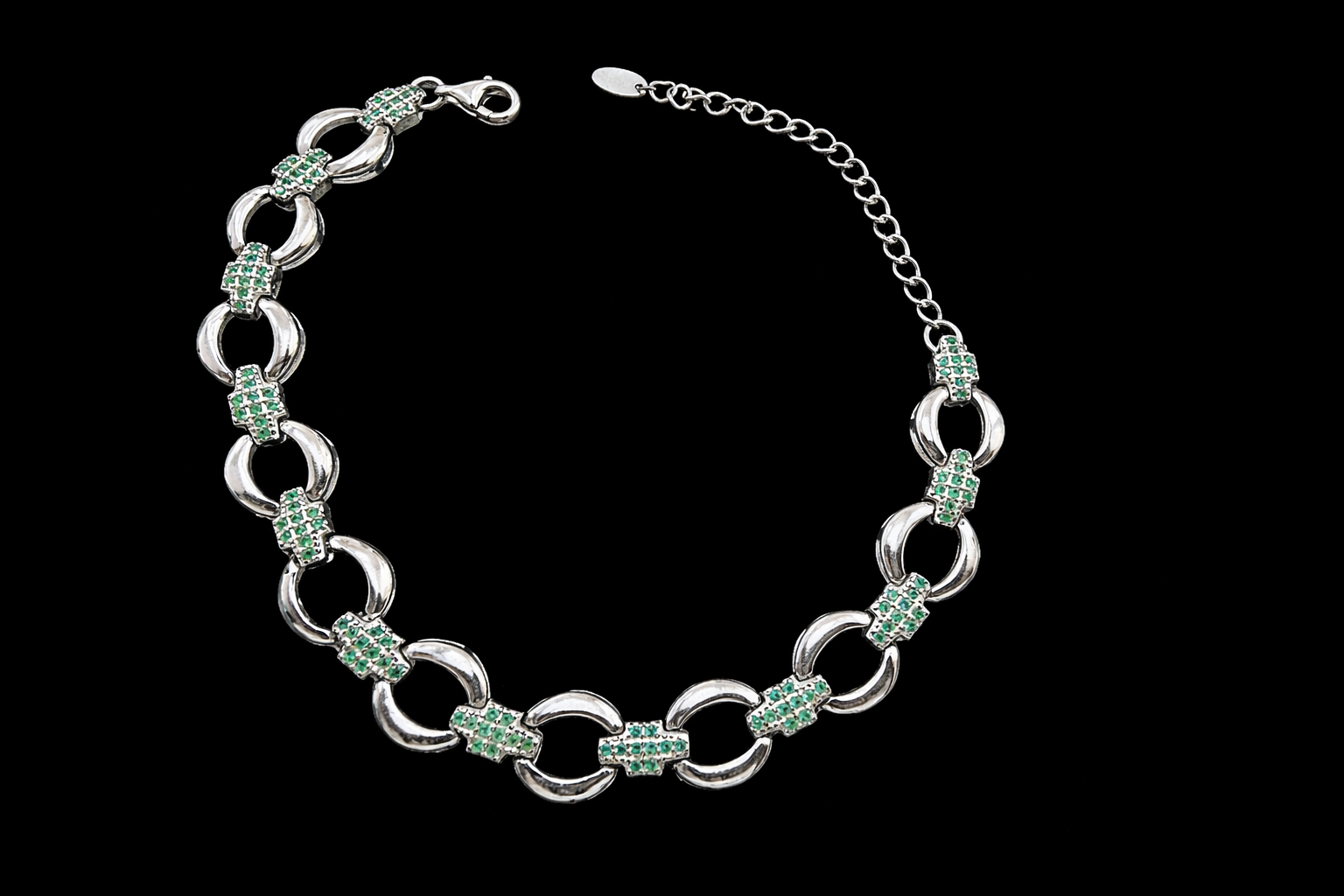 12.3 gms Silver Bracelet Green Cubic Zircon Design for ladies near me Adjustable Silver Rate About Jewelry : The diamonds is setted with micro setting to make the look more better.The plating thickness is 0.3mm of high Grade Rohdium Which make Jewelry life long last then normal Polishing. Its all nickel free which is safe for your skin BT154_GRN