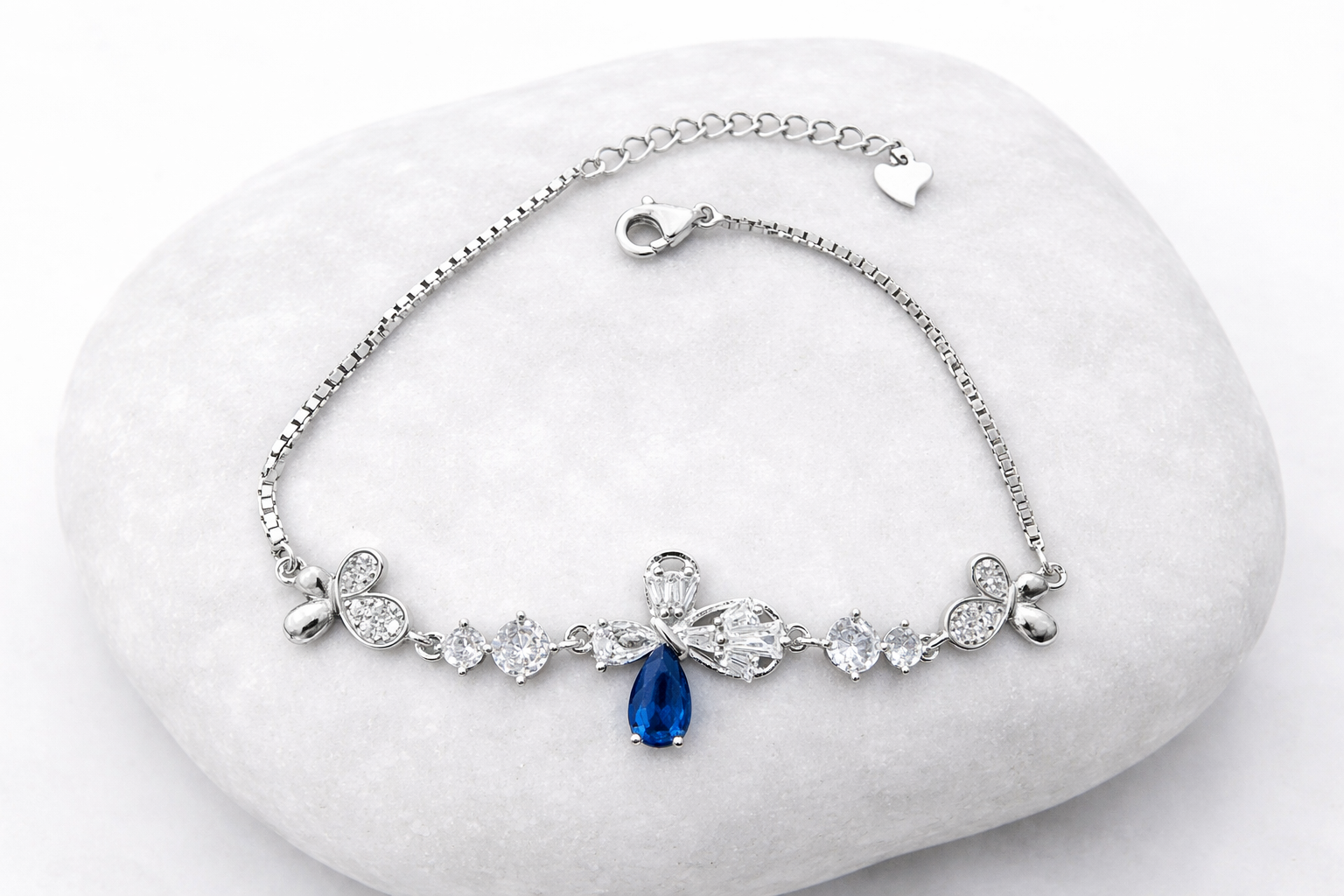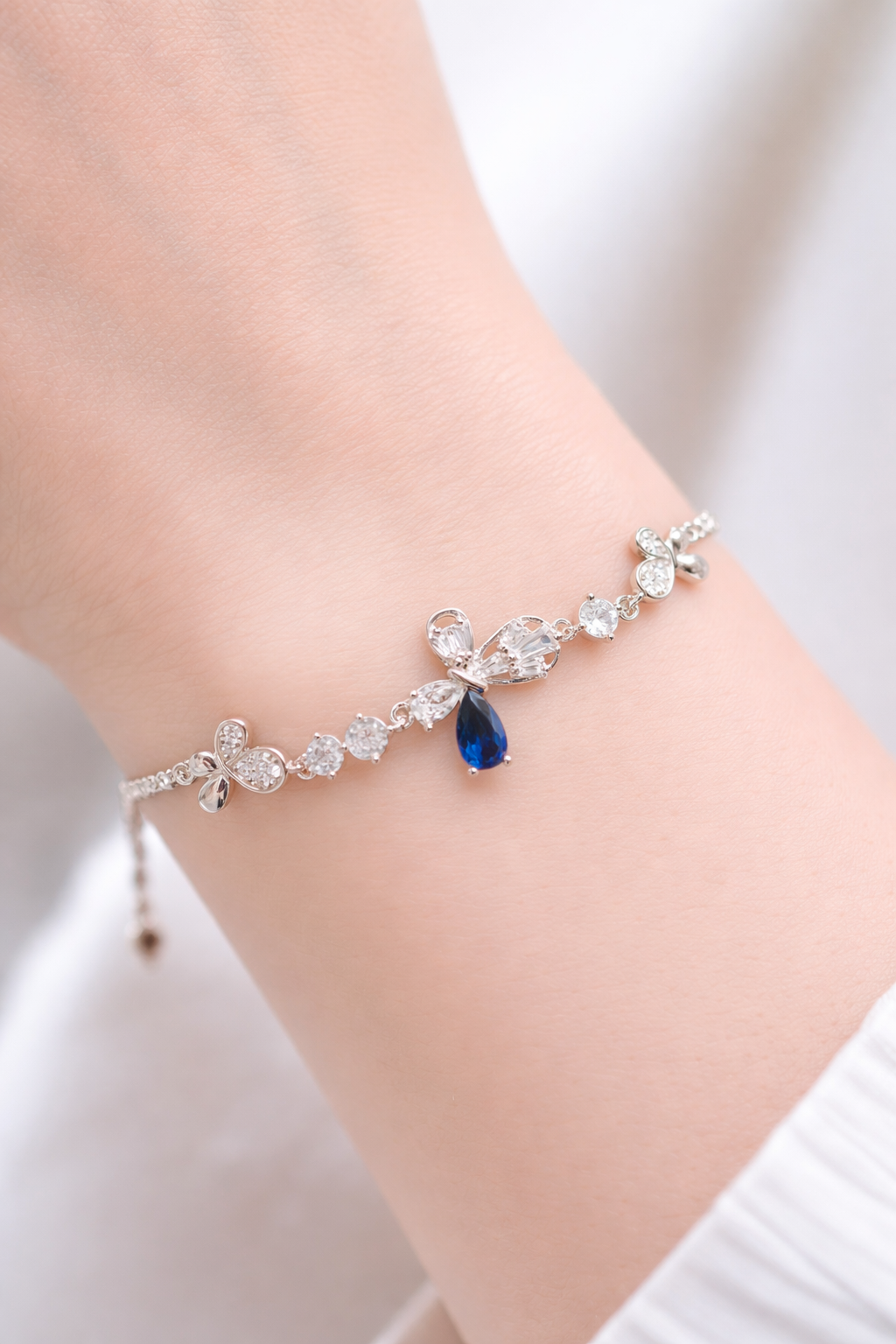 4.4 gms Silver Bracelet Blue Cubic Zircon Design for girls near me Adjustable Silver Rate About Jewelry : The diamonds is setted with micro setting to make the look more better.The plating thickness is 0.3mm of high Grade Rohdium Which make Jewelry life long last then normal Polishing. Its all nickel free which is safe for your skin BT155_BLU