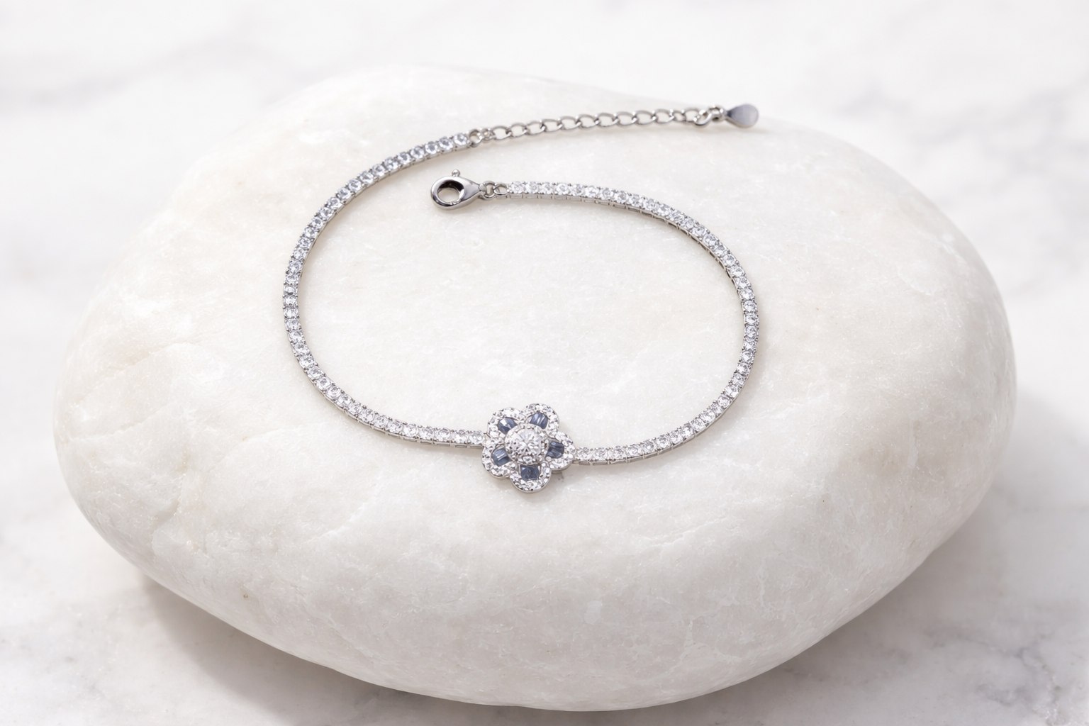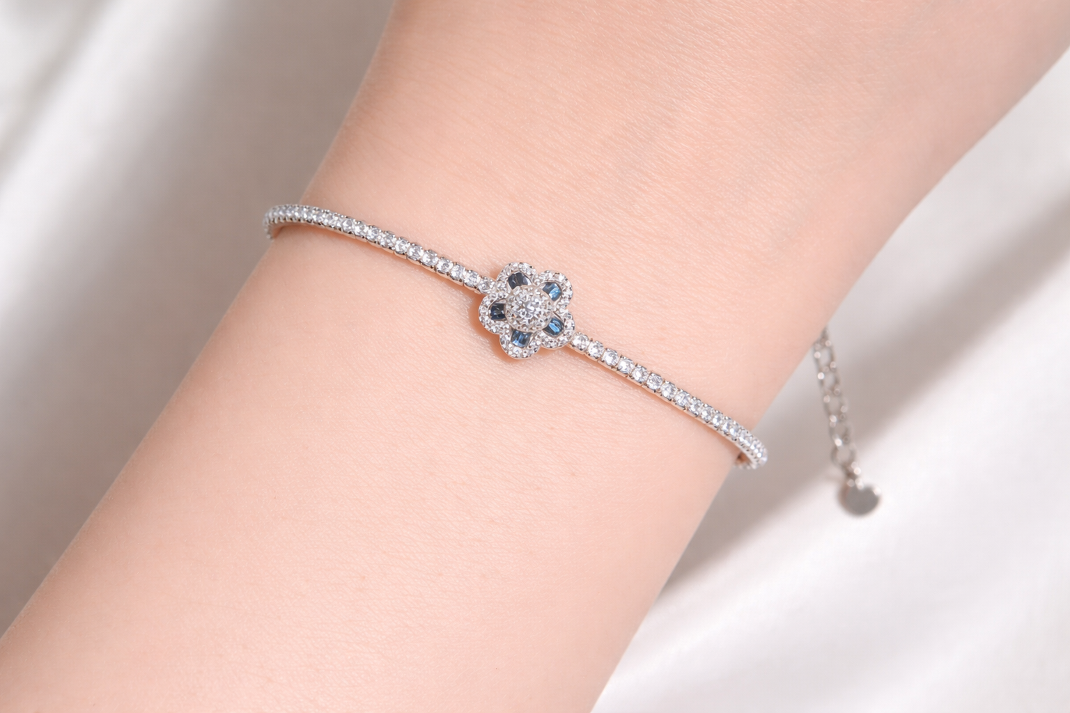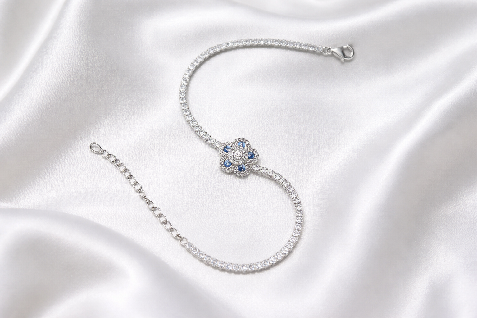 5.4 gms Silver Bracelet Blue Cubic Zircon Design for ladies near me Adjustable Silver Rate About Jewelry : The diamonds is setted with micro setting to make the look more better.The plating thickness is 0.3mm of high Grade Rohdium Which make Jewelry life long last then normal Polishing. Its all nickel free which is safe for your skin BT162_BLU