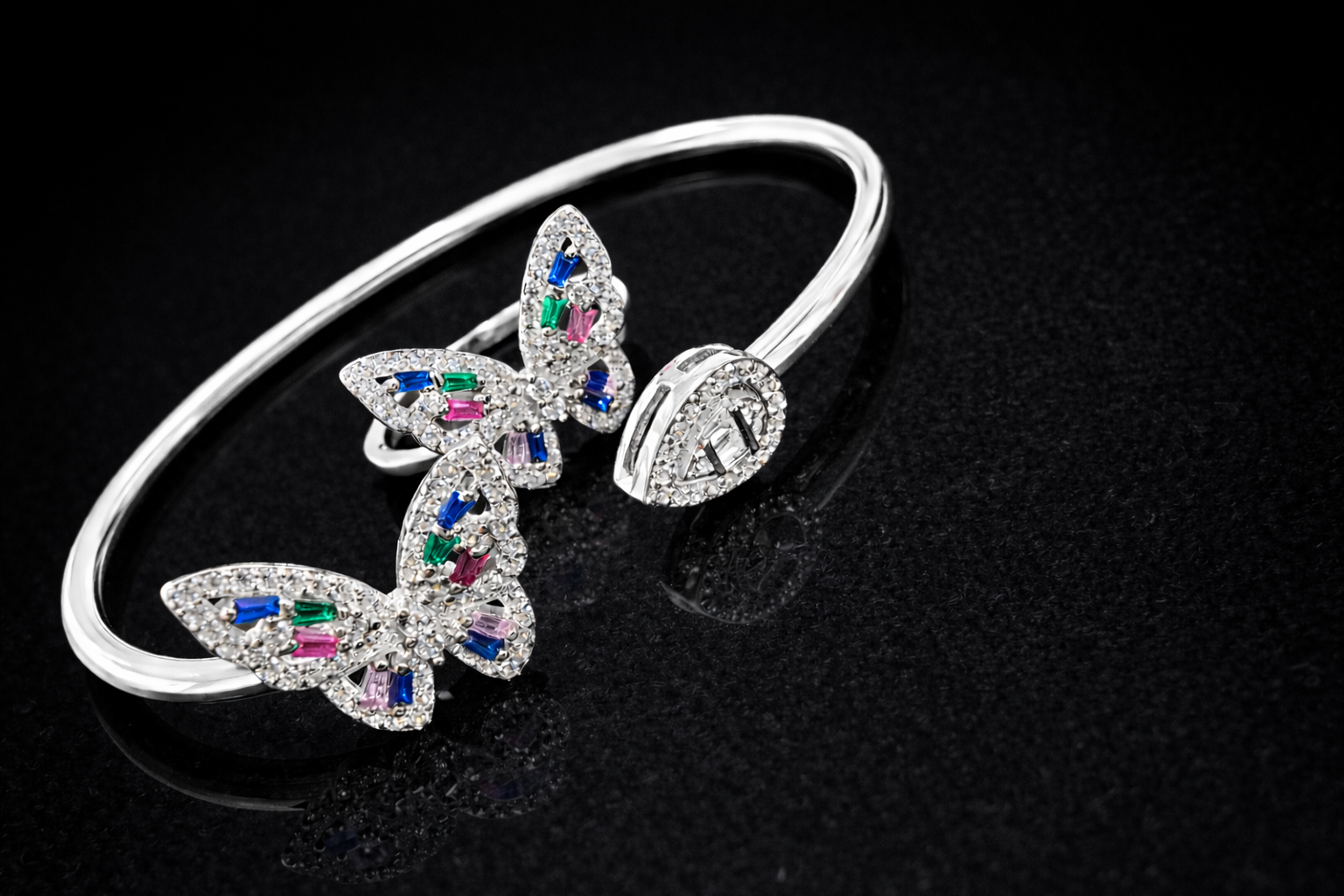 10 gms Silver Bangle and Ring Set Multi colour Cubic Zircon Design for ladies near me real silver 925 About Jewelry : The diamonds is setted with micro setting to make the look more better.The plating thickness is 0.3mm of high Grade Rohdium Which make Jewelry life long last then normal Polishing. Its all nickel free which is safe for your skin BF118_MLT