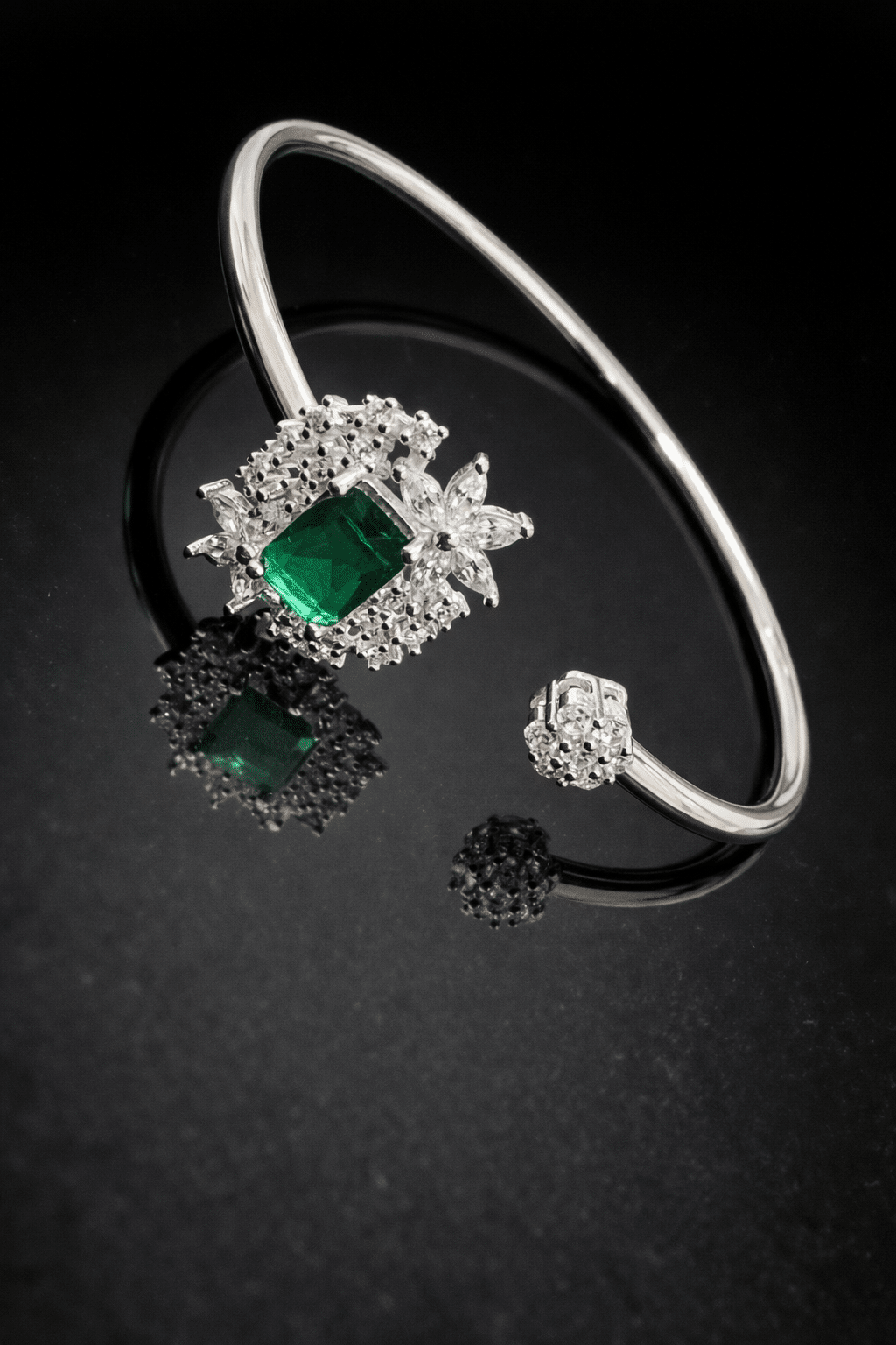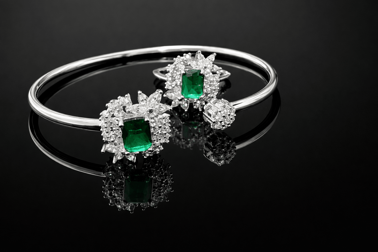 10 gms Silver Bangle and Ring Set Green Cubic Zircon Design for women near me real silver 925 About Jewelry : The diamonds is setted with micro setting to make the look more better.The plating thickness is 0.3mm of high Grade Rohdium Which make Jewelry life long last then normal Polishing. Its all nickel free which is safe for your skin BF124_GRN