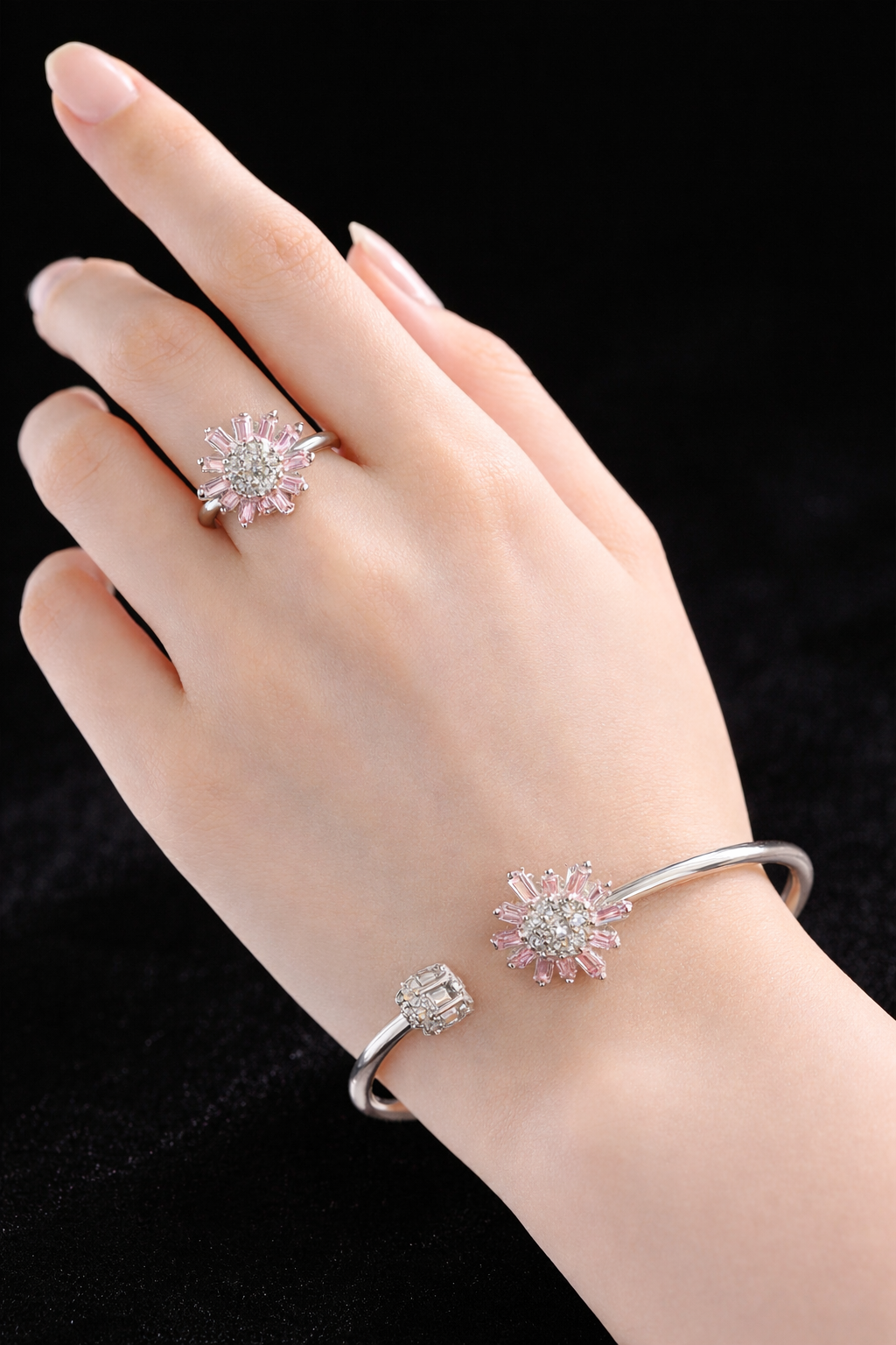 10 gms Silver Bangle and Ring Set Pink Cubic Zircon Design for women near me Pure Silver 925 About Jewelry : The diamonds is setted with micro setting to make the look more better.The plating thickness is 0.3mm of high Grade Rohdium Which make Jewelry life long last then normal Polishing. Its all nickel free which is safe for your skin BF129_PNK