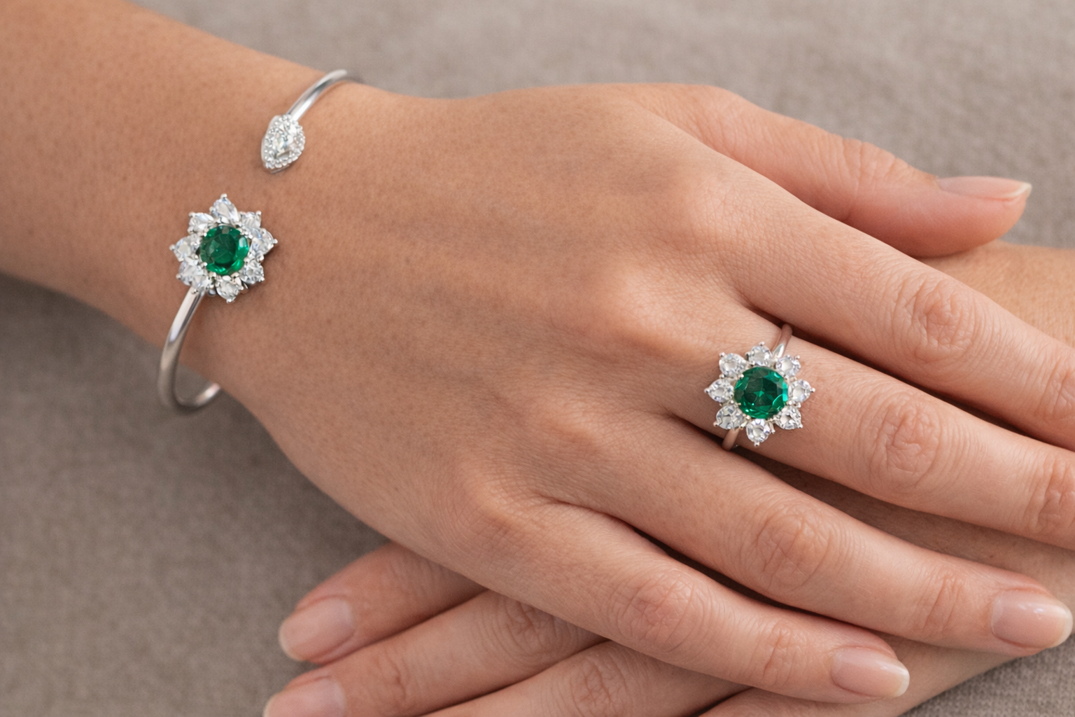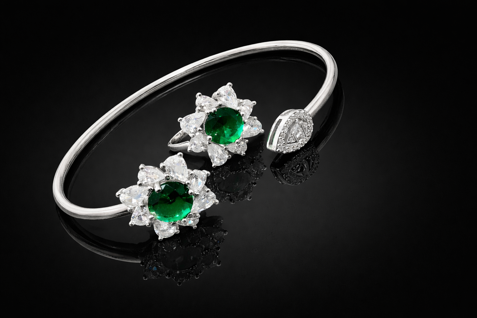 10 gms Silver Bangle and Ring Set Green Cubic Zircon Design for women online Pure Silver 925 About Jewelry : The diamonds is setted with micro setting to make the look more better.The plating thickness is 0.3mm of high Grade Rohdium Which make Jewelry life long last then normal Polishing. Its all nickel free which is safe for your skin BF130_GRN