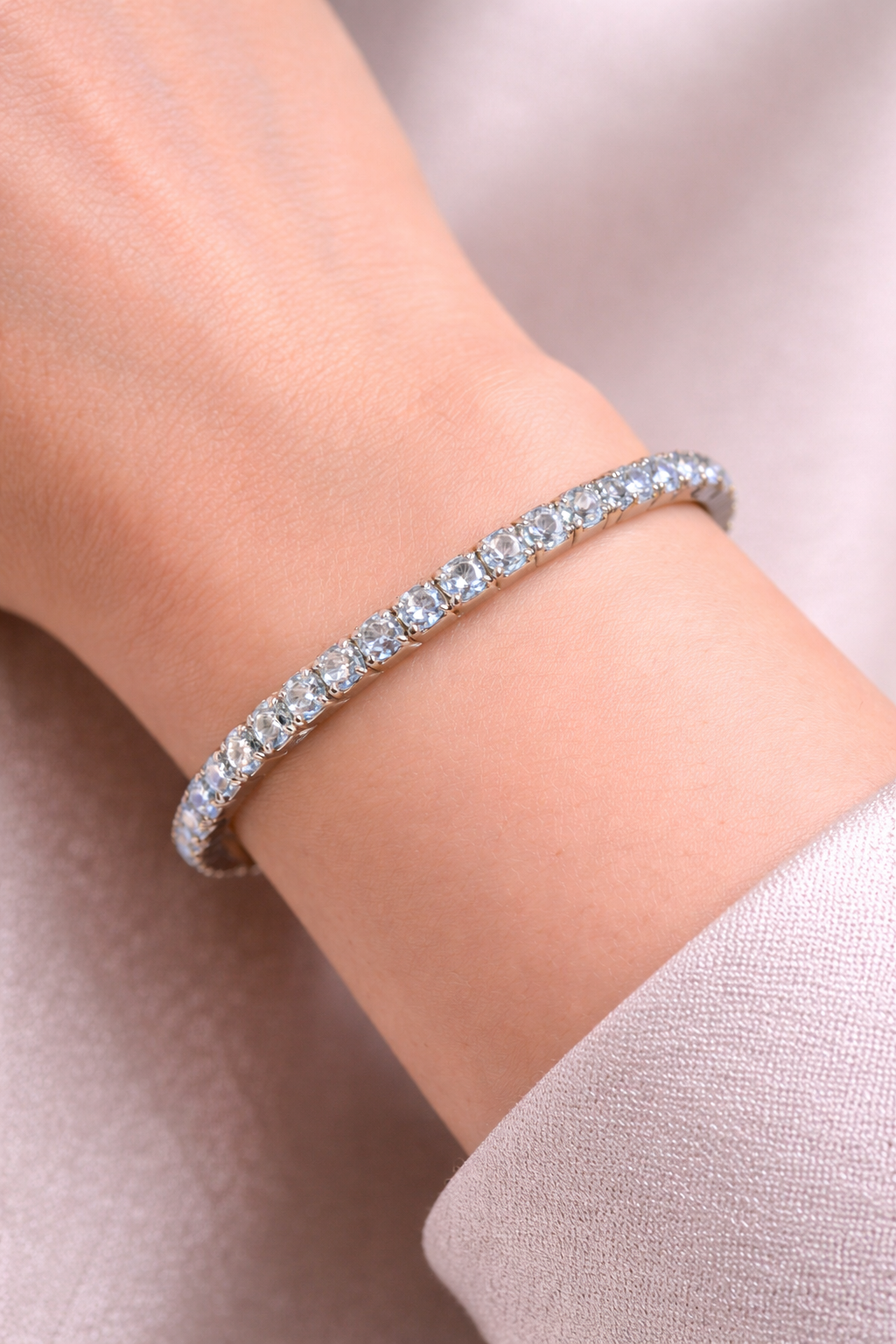 5.6 gms Silver Bangle Sky Blue Cubic Zircon Design for women near me Pure Silver 925 About Jewelry : The diamonds is setted with micro setting to make the look more better.The plating thickness is 0.3mm of high Grade Rohdium Which make Jewelry life long last then normal Polishing. Its all nickel free which is safe for your skin BT113